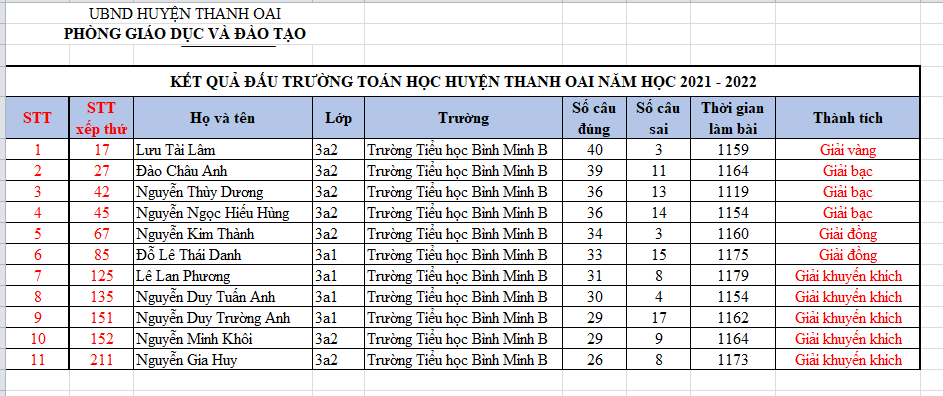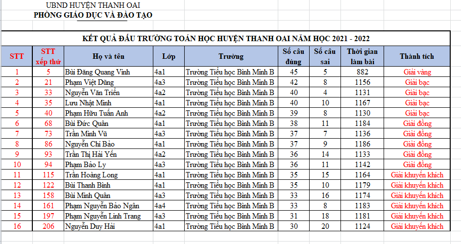 KẾT QUẢ THI ĐẤU TRƯỜNG TOÁN HỌC CẤP HUYỆN NĂM HỌC 2021-2022 CỦA TRƯỜNG TIỂU HỌC BÌNH MINH B
