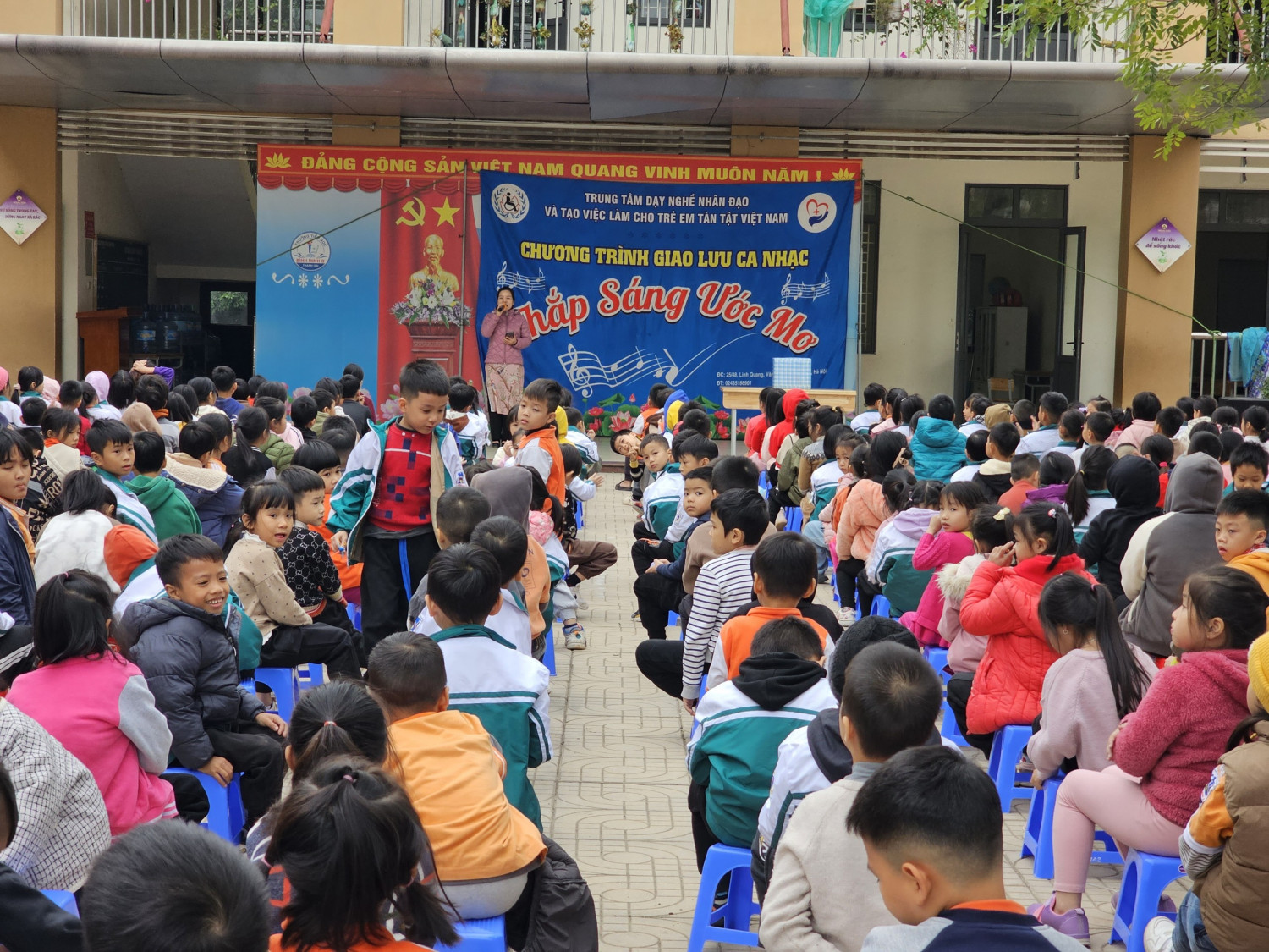 Để chia sẻ và làm dịu đi những nổi đau đó,chung tay cùng với xã hội, phát huy tinh thần tương thân tương ái của dân tộc Việt Nam, chia sẻ tình thương đến những người kém may mắn, đặc biệt là những bạn phải mang trên mình nỗi đau da cam. Vào lúc 15h15phút ngày 19 tháng 12 năm 2023 toàn thể các thầy, cô giáo và các em học sinh trường TH Bình Minh B đã có buổi giao lưu văn nghệ với Trung tâm dạy nghề nhân đạo và tạo việc làm cho trẻ em tàn tật Việt Nam với chủ đề “ Thắp sáng ước mơ”.