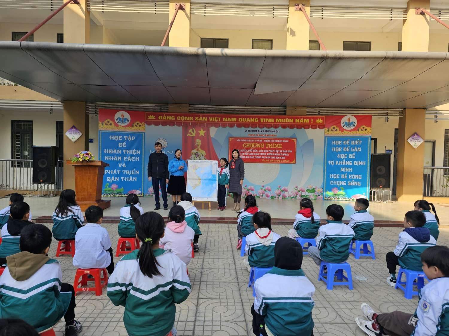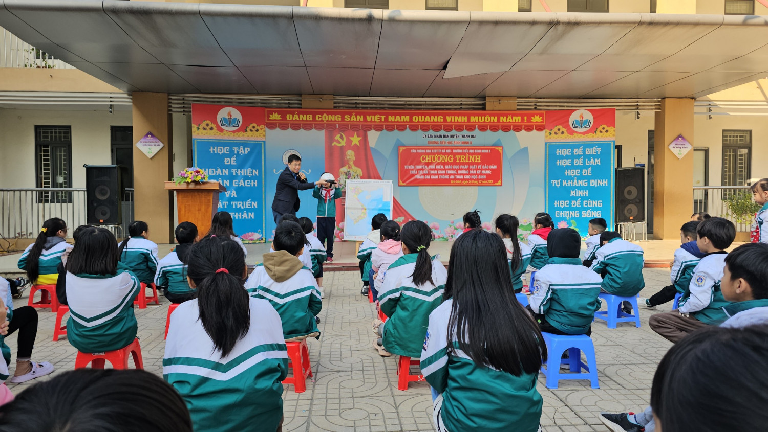 Ngày 26/12/2023, căn cứ kế hoạch phối hợp tuyên truyền, phổ biến, giáo dục pháp luật về bảo đảm trật tự, an toàn giao thông, hướng dẫn kỹ năng tham gia giao thông an toàn cho học sinh năm học 2023-2024 của Ban An toàn giao thông thành phố Hà Nội đến trường Tiểu học Bình Minh B tuyên truyền an toàn giao thông cho học sinh toàn trường.